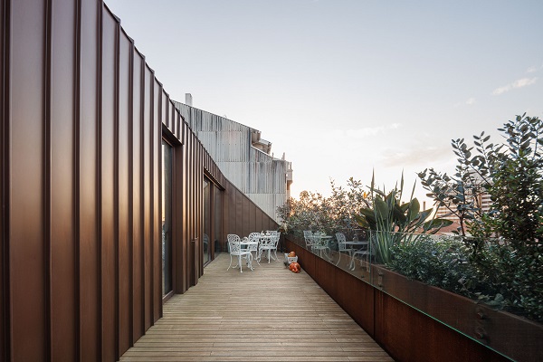 Na fachada Posterior, o volume assume uma altura de cinco pisos. O desenho da cobertura dá continuidade dos dois alçados.