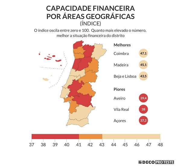 O índice que mede a capacidade financeira das famílias também não deixa espaço para dúvida: em 2022, atingiu o valor mais baixo desde há 5 anos – 42,1 (de 0 a 100; em que quanto mais elevado o número, maior a capacidade financeira para enfrentar as despesas mensais). Em termos geográficos, é nos Açores que o índice apresenta piores resultados (37,2), seguindo-se os distritos de Vila Real (38) e Aveiro (39,4). Em maior desafogo financeiro estão os distritos de Coimbra (47,1) Beja (43,5), Lisboa (43,5) e a Região Autónoma da Madeira (45,1). Despesas com alimentação e habitação à lupa Há mais de um ano que a DECO Proteste analisa o aumento do preço do cabaz alimentar e as flutuações das taxas de juros.