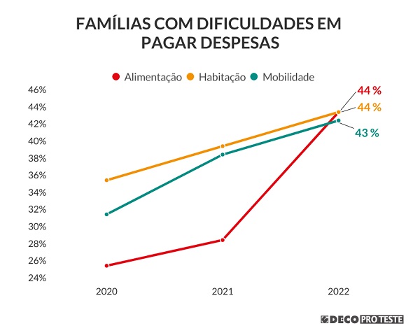 Comparativamente a 2021, o Barómetro da Deco Proteste revela que a dificuldade em enfrentar as despesas com a alimentação sofreu o maior aumento (15%), seguindose as despesas com a habitação (5%) e a mobilidade (4%).