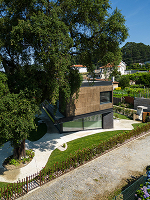 Do Alçado voltado à rua fecha-se para a mesma, destacando-se apenas o volume de marcação da entrada, abrindo a moradia a Sul para a paisagem e para o espaço ajardinado.