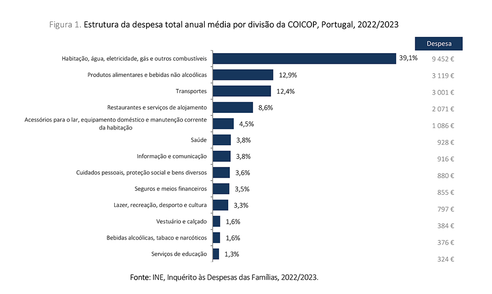 De acordo com os resultados provisórios do Inquérito às Despesas das Famílias 2022/2023, a despesa anual média dos agregados familiares foi, nesse período, de 24.190 euros. Cerca de 2/3 da despesa média das famílias concentrou-se em encargos associados à habitação (39,1%), à alimentação (12,9%) e aos transportes (12,4%).