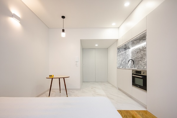 Uma grande cuba cerâmica serve simultaneamente a instalação sanitária, a kitchenette e a lavagem de roupa (embora sejam disponibilizadas máquinas comunitárias de lavagem e secagem de roupa no piso térreo). Esta cuba à parte de um aparador que apoia também a entrada das unidades, com espaços para sapatos e chaves.
