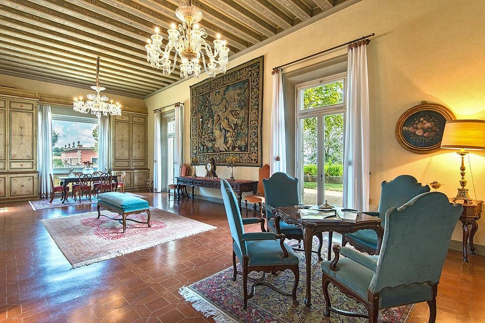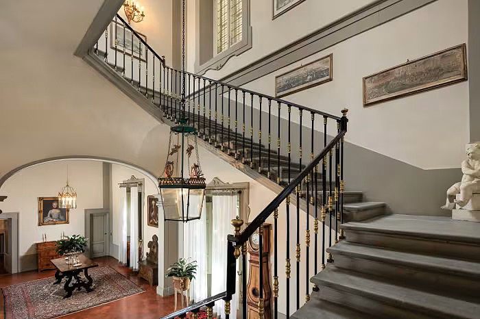A villa de 2800 m2 foi colocada à venda pela Sotheby's International Realty Italia e está inserida numa bela propriedade de 26,7 hectares. A mansão tem 14 quartos e 15 casas de banho, uma piscina, um campo de ténis e até uma capela privada com uma planta poligonal. Uma biblioteca e uma sala de fitness juntam-se à longa lista de divisões da villa. A majestosa fachada da casa é visível, com o seu elegante relógio a encimar a mansão. No segundo andar, um grande terraço oferece uma vista panorâmica da planície de Florença. Um laranjal, uma garagem e uma casa de caseiro completam a propriedade.
