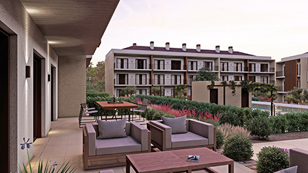 O design paisagístico dos arruamentos assegura uma excelente acessibilidade criando um espaço onde a comunidade pode coexistir e conviver, com zona comercial, espaços verdes, parque infantil e piscina comuns que oferecem a serenidade para relaxar e desfrutar.