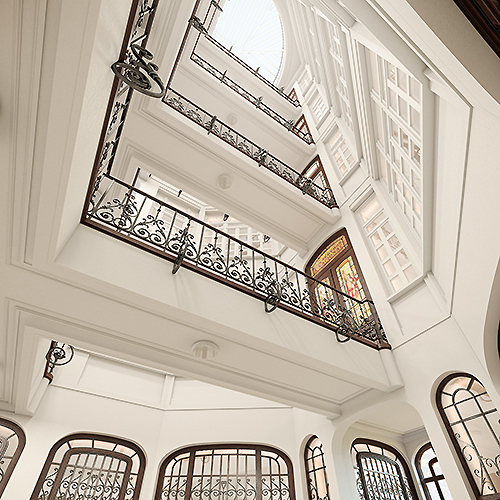 Os apartamentos têm um invulgar pé direito alto, envolvidos por janelas e bow-windows com uma escala monumental, elementos que emprestam um inigualável valor patrimonial a alguns dos edifícios que coabitam na morada mais importante do Porto.
