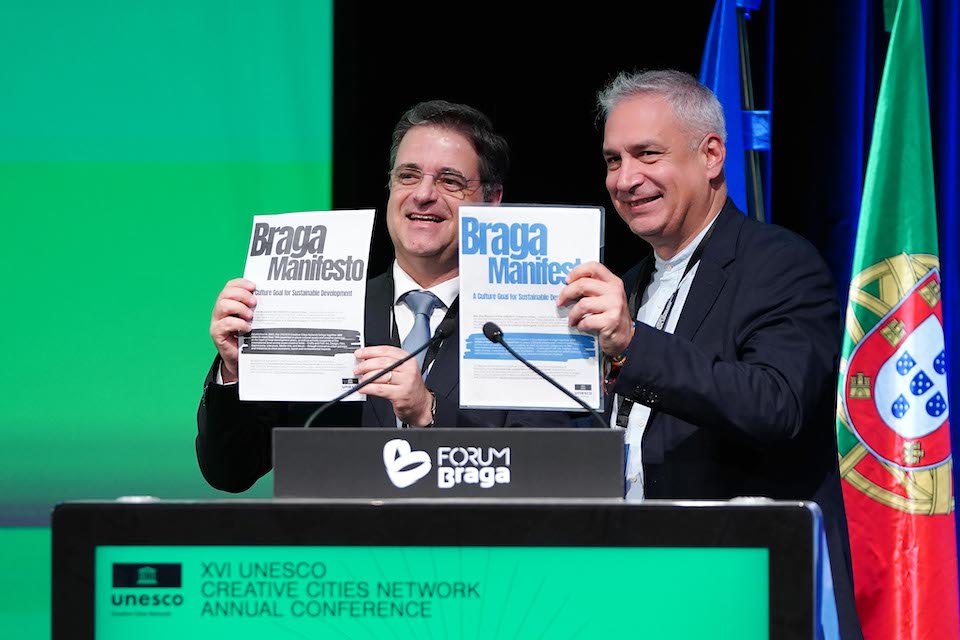 No segundo dia da XVI Conferência Anual da Rede das Cidades Criativas da Unesco, que decorre em Braga até à próxima sexta-feira, 5 de Julho, foi aprovado o "Manifesto de Braga das Cidades Criativas da UNESCO: Um Objectivo Cultural para o Desenvolvimento Sustentável" que constitui um verdeiro pacto para o futuro das Cidades e uma ferramenta crucial para a afirmação da Cultura como um pilar fundamental do desenvolvimento sustentável dos territórios.