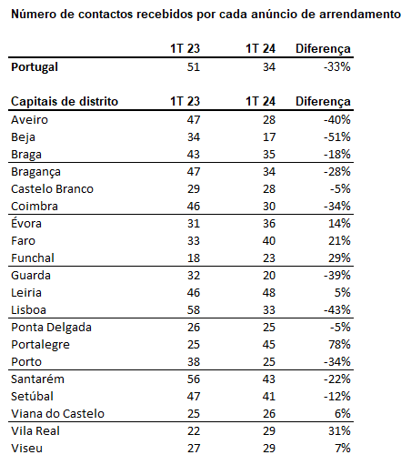 A média de contactos por anúncio no primeiro trimestre, diminuiu em 12 capitais de distrito nos últimos doze meses. Beja foi a cidade onde média de contactos mais desceu, com menos 51% de contactos recebidos. Seguem-se Lisboa (-43%), Aveiro (-40%), Guarda (-39%), Coimbra (-34%), Porto (-34%), Bragança (-28%), Santarém (-28%), Braga (-18%), Setúbal (-12%), Ponta Delgada (-5%) e Castelo Branco (-5%),