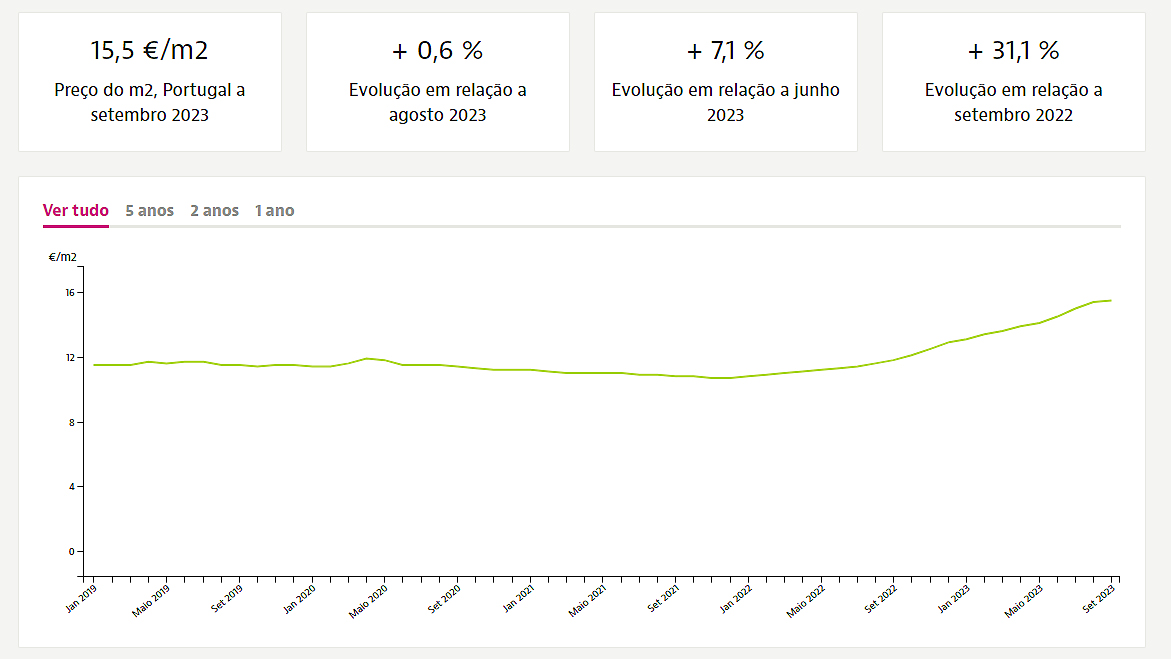 Os preços das casas para arrendar em Portugal apresentaram uma subida de 7,1% no terceiro trimestre do ano face ao trimestre anterior. Segundo o índice de preços do idealista, arrendar casa tinha um custo de 15,5 euros por metro quadrado (euros/m2) no final do mês de setembro, tendo em conta o valor mediano. Já em relação à variação mensal, a subida foi de 0,6%.
