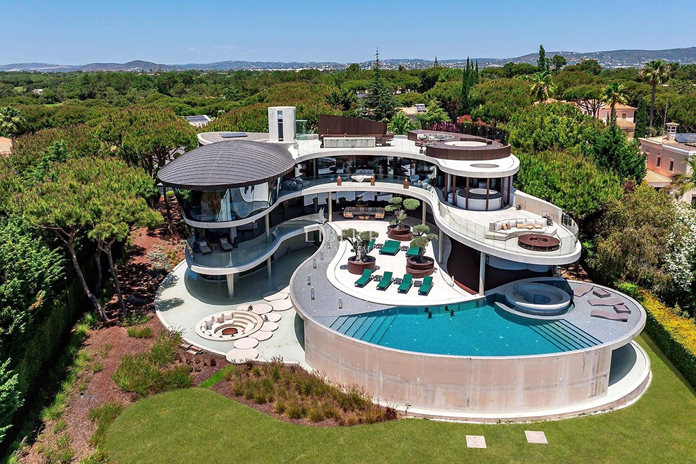 7. Mansão de luxo com spa no Algarve. Situada num terreno de 2030m² e com uma área de construção de 1192m², esta casa destaca-se pela sua magnífica exposição solar, piscina infinita e áreas de lazer ao ar livre. Com sete quartos em suite e oito casas de banho, possui um design moderno e materiais de alta qualidade. O hall de entrada, com pé direito alto, dá acesso a uma escadaria giratória em torno de um elevador circular, oferecendo uma vista panorâmica 360º. A cave inclui um spa com piscina interior, sauna, sala de cinema, e três quartos em suite para convidados. Preço: 13,5 milhões de euros.