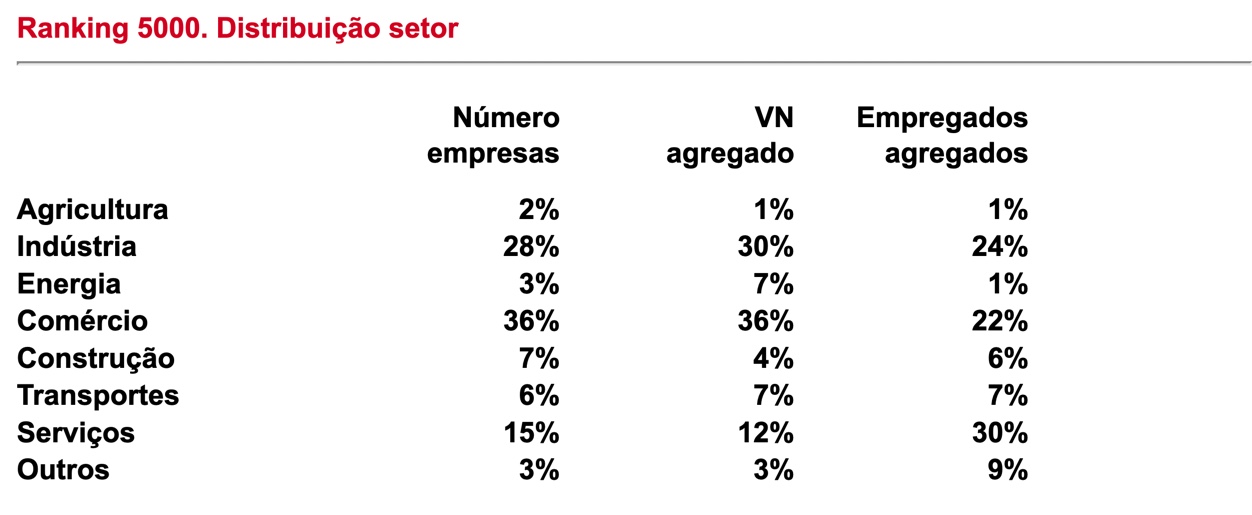 Os principais sectores que compõem o Ranking 5000 são o Comércio (36% das empresas, com os mesmos 36% em volume de negócios, 22% no emprego) e a Indústria (28% das empresas, 30% em volume de negócios, 24% no emprego), seguidos dos Serviços (15% das empresas, 12% em volume de negócios, 30% no emprego). Com percentagens abaixo dos dois dígitos destaque para os sectores Agrícola (2% em número de empresas, 1% em volume de negócios e 1% em empregos), Transportes (6% número de empresas, 7% volume de negócios e 7% empregos) e Construção (7% em número de empresas, 4% em volume de negócios e 6% em empregos).