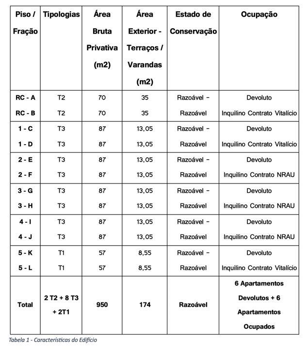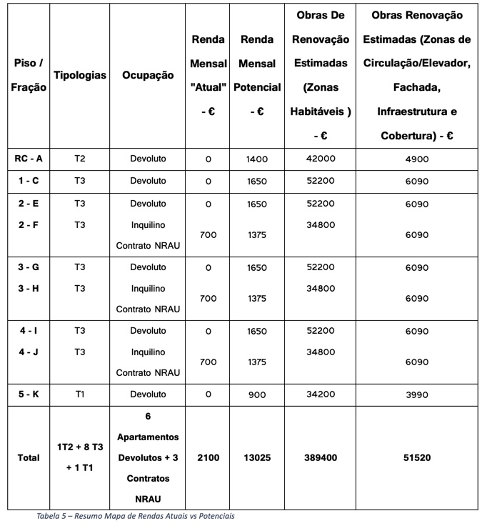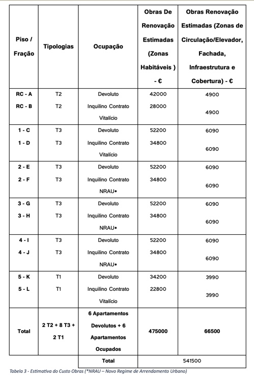 Na tabela 3, apresenta-se uma estimativa de custos de renovação por apartamento, incluindo melhorias das zonas comuns.