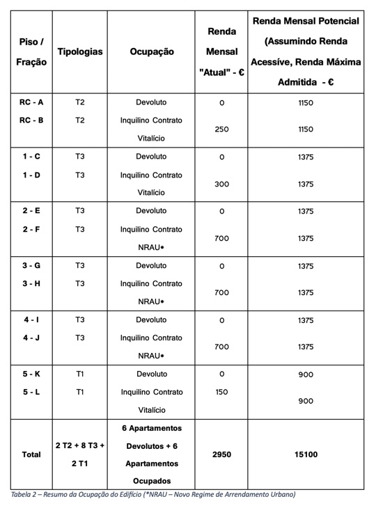 O cenário de ocupação inicial do edifício proporcionava um rendimento anual de 35 400€, assumindo as 12 frações de utilização independente e o regime de propriedade total.
