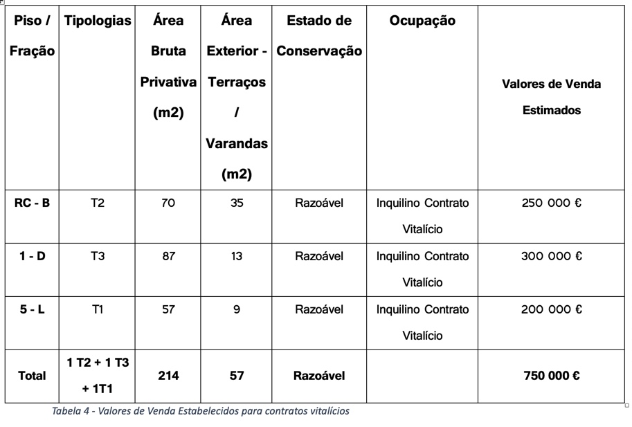 No concreto vamos assumir a venda dos três apartamentos com contrato vitalício, estabelecendo o valor de venda unitário (preço por m2) de acordo com o Valor de Mercado obtido na Avaliação para a venda do ativo em regime de propriedade total (2 895€/m2).