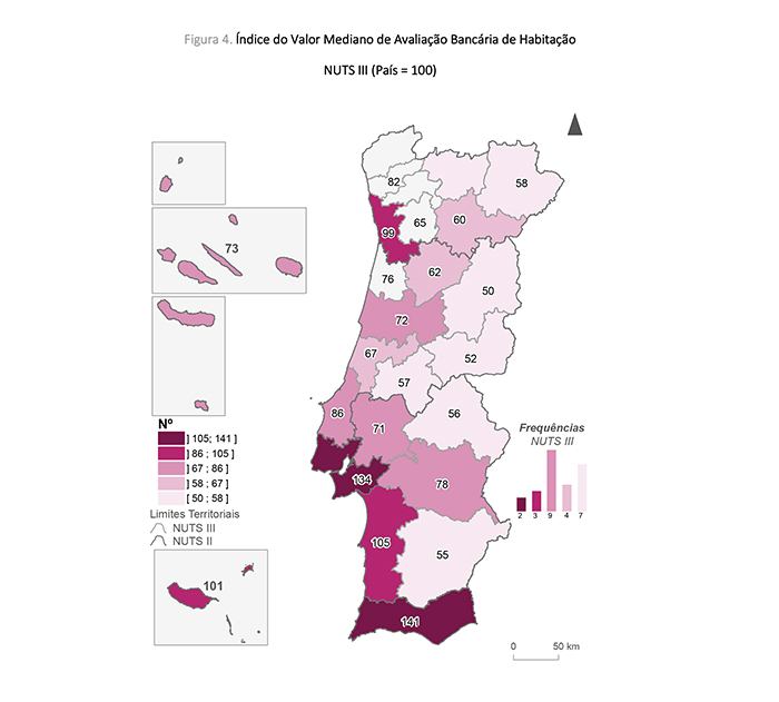 De acordo com o Índice do valor mediano de avaliação bancária, em fFevereiro de 2023, o Algarve, a Área Metropolitana de Lisboa, o Alentejo Litoral e a Região Autónoma da Madeira apresentaram valores de avaliação 40,9%, 34,2%, 5,3% e 1,5%, respectivamente, superiores à mediana do país. Beiras e Serra da Estrela foi a região que apresentou o valor mais baixo em relação à mediana do país (-50,2%).