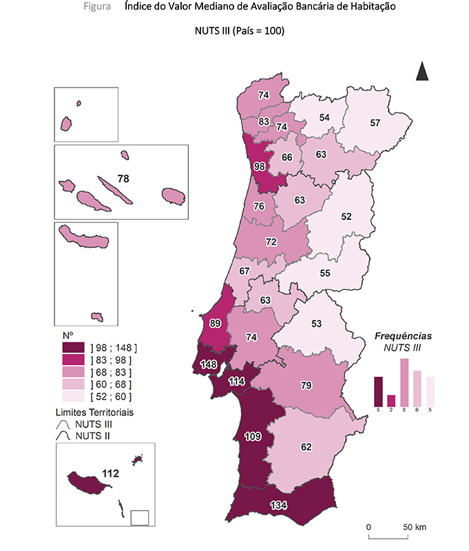 De acordo com o Índice do valor mediano de avaliação bancária, em Dezembro de 2023, a Grande Lisboa, o Algarve, a Península de Setúbal, a Região Autónoma da Madeira e o Alentejo Litoral apresentaram valores de avaliação 47,6%, 34,4%, 14,1%, 11,8% e 9,0%, respectivamente, superiores à mediana do país. Beiras e Serra da Estrela, Alto Alentejo e Alto Tâmega e Barroso foram as regiões que apresentaram valores mais baixos em relação à mediana do país (-47,9%, -46,6% e -45,7% respectivamente).