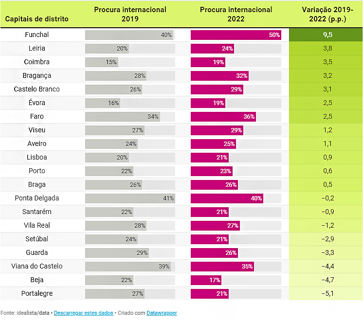 E quais são as capitais de distrito portuguesas onde há maior interesse dos estrangeiros para arrendar uma habitação? De acordo com os mesmos dados relativos ao final de 2022, é no Funchal, em Viana do Castelo e em Bragança, onde os cidadãos estrangeiros mais procuram casas para arrendar, pesando 49%, 43% e 42% no total da procura em cada cidade, respectivamente. Já Portalegre, Évora e Beja são as cidades que sentiram uma menor procura internacional no mercado de arrendamento no final de 2022, muito embora represente entre 20% e 23% do total.