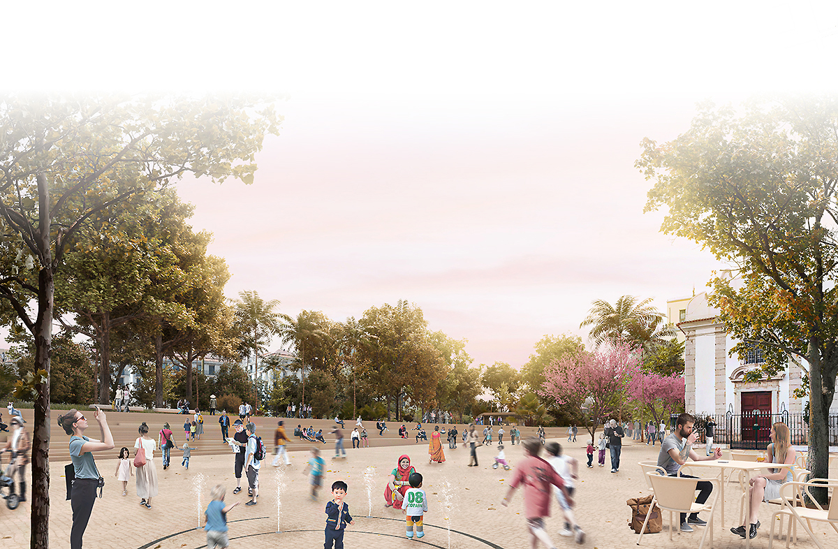 “Revelar a história, resgatar o vale”, “um novo jardim para as pessoas”, “vivo e enraizado na cidade” e “fundado num solo do mundo” são os quatro eixos do projecto de Filipa Cardoso de Menezes & Catarina Assis Pacheco para a requalificação da Praça do Martim Moniz, destacando o património histórico da Cerca Fernandina, inclusive a Porta da Mouraria, uma das portas de entrada para a cidade medieval.