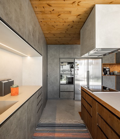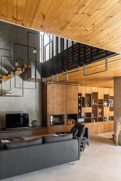 Esta foi a narrativa que iniciou o percurso mental que conecta todos os espaços interiores. Quando chegam à porta, os convidados ainda não antecipam os espaços que vão encontrar, pois os volumes não permitem olhar para o interior. A porta abre-se para um corredor cinza, ligeiramente escurecido para convidar à exploração da luz, criando assim uma expectativa sobre o que vai ser visto de seguida. Os primeiros raios de luz natural são um convite para a sala. Os próximos passos revelam um teto alto, que conecta o piso superior através de escadas suspensas que utilizam a mesma madeira encontrada no exterior da casa e em toda a atmosfera social e de trabalho.