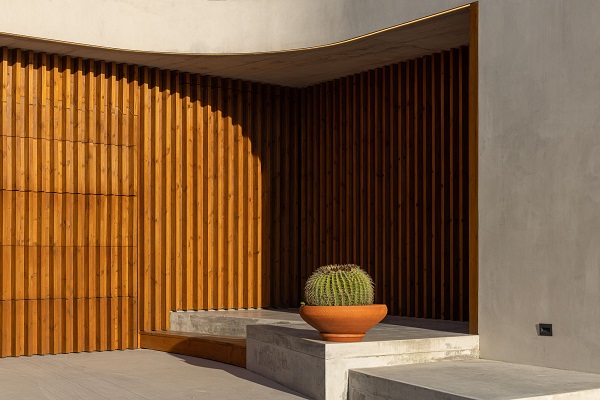 quente da madeira. Existe também um continuidade do chão expandido até uma varanda, que se encontra protegida por um ripado de madeira, filtrando a vista de fora enquanto permite que os habitantes vejam o exterior.