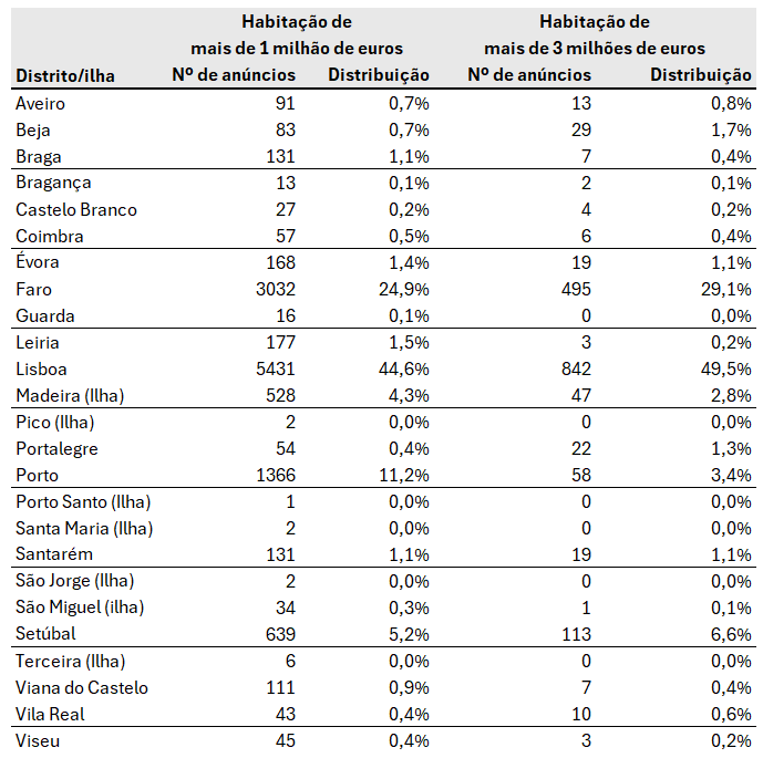 Praticamente todos os distritos de Portugal continental e ilhas possuem, pelo menos, uma casa anunciada no portal imobiliário que custa mais de um milhão de euros. No entanto, a distribuição delas não é homogénea, visto que os distritos de Lisboa, Faro e Porto concentram 81% de todas as casas disponíveis acima desse valor. Em distritos e ilhas com menos de seis casas anunciadas, a participação percentual é insignificante, por isso aparecem como 0%.