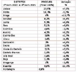 O maior interesse nas casas do interior do país é uma tendência que se tem verificado nos últimos dois anos, com 2021 a registar um aumento global de +14% face a 2020 e de +51% face a 2019. Nos primeiros seis meses de 2022, os distritos intermédios mais procurados são, por esta ordem, Braga, Setúbal, Leiria, Faro, Coimbra e Aveiro. Por outro lado, os distritos que revelam menor procura de casa foram Vila Real, Beja, Bragança, Guarda e Portalegre.