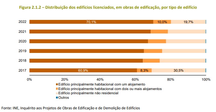 De acordo com a dados do INE (Estatísticas da Construção e Habitação 2022, ISSN 0377-2225), no ano de 2022, 70,1% dos processos de licenciamento, em Portugal, destinavam-se a Edifícios principalmente habitacionais com um alojamento, contra 10% de Edifícios principalmente habitacionais com dois ou mais alojamentos. Se é verdade que desde 2017 a tendência foi para que se aumentasse o número de licenciamentos de habitações uni e multifamiliares, a verdade é que isto se deveu a um decréscimo em licenciamentos de edifícios não residenciais.