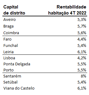 Analisando por capitais de distrito, é em Santarém onde é mais rentável a compra de uma casa para investimento, sendo o seu retorno na ordem dos 8%. Seguem-se as cidades de Viana do Castelo (6,1%), Leiria (6,1%), Braga (5,7%), Coimbra (5,6%), Ponta Delgada (5,5%), Porto (5,5%), Funchal (5,4%) e Setúbal (5,4%).