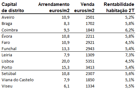 Analisando por capitais de distrito, é em Leiria onde é mais rentável a compra de uma casa para investimento, sendo o seu retorno na ordem dos 7,3%. Seguem-se as cidades de Coimbra (6,2%), Évora (5,8%), Braga (5,8%), Setúbal (5,6%), Viseu (5,5%), Funchal (5,4%), Porto (5,4%) e Aveiro (5,2%).