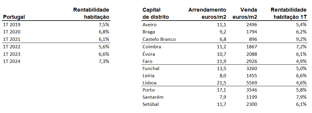 Analisando por capitais de distrito, é em Castelo Branco onde é mais rentável a compra de uma casa para investimento, sendo o seu retorno na ordem dos 9,2%. Seguem-se as cidades de Santarém (7,9%), Coimbra (7,2%), Leiria (6,6%), Braga (6,2%), Évora (6,1%), Setúbal (6,1%), Porto (5,8%) e Aveiro (5,4%).