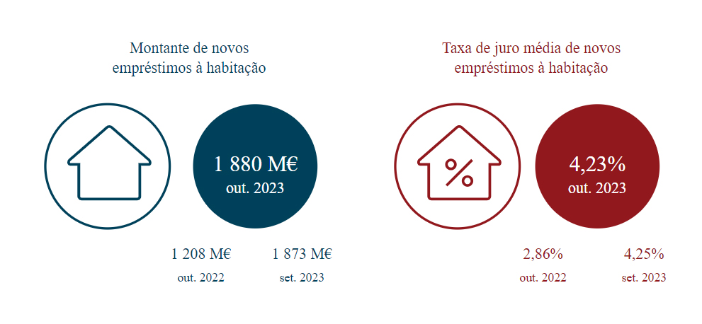 A taxa de juro média dos novos empréstimos à habitação diminuiu ligeiramente, de 4,25% em Setembro para 4,23% em Outubro. A taxa de juro média dos novos empréstimos para outros fins também diminuiu, de 5,35% para 5,33%. Nos novos empréstimos para consumo, subiu de 8,97% para 9,18%.