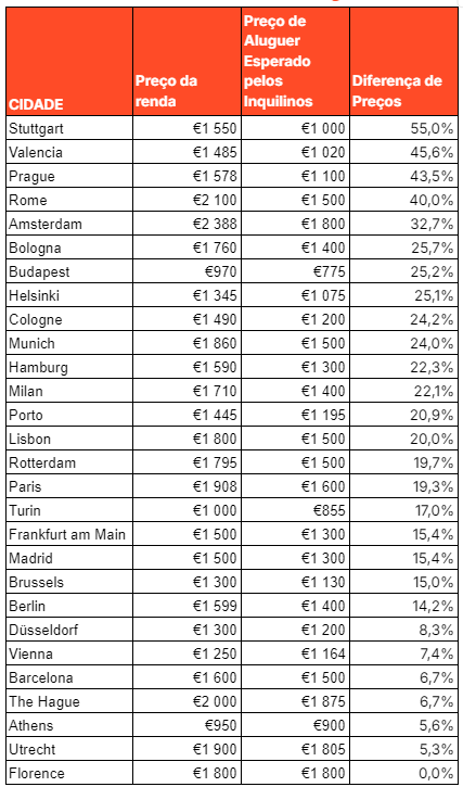 Na cidade do Porto, a discrepância de expectativas encontra-se nos 250 euros , uma diferença de 20,9%, onde a mediana de renda é de 1.445 euros e a expectativa é de 1.195 euros. Já em Lisboa, a mediana dos preços das rendas está em 1.800 euros e uma expectativa de 1.150 euros, perfazendo uma diferença de 20,0%, ou seja 300 euros. O desfasamento entre as expectativas e a realidade nas duas cidades portuguesas é ligeiramente superior à média europeia (19,8%).