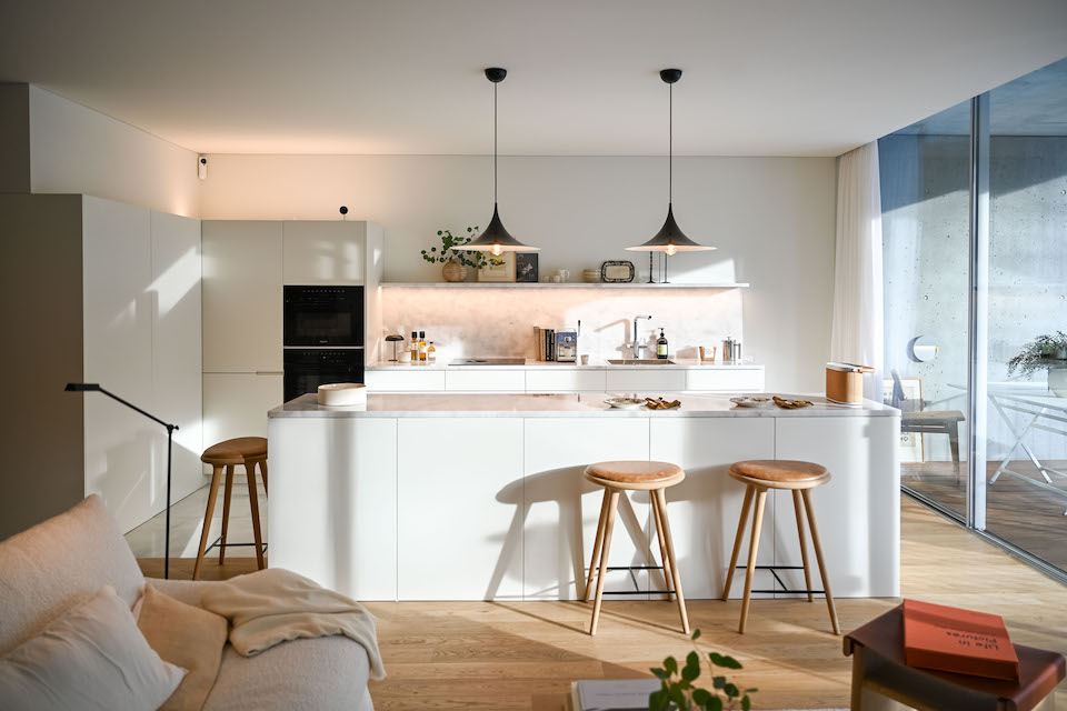 De destacar as espaçosas varandas que se apresentam como um elo entre o espaço interior da habitação e a paisagem da cidade de Aveiro. As cozinhas completam a fluidez dos espaços, e permitem usufruir também da vista da ria.