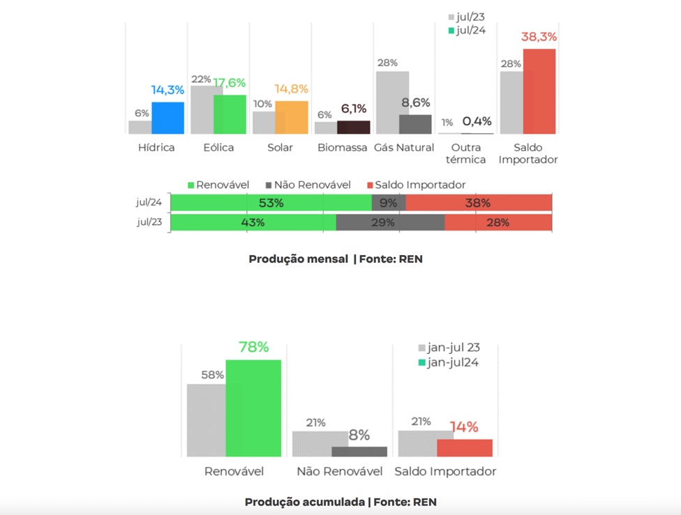 No Boletim Clima e Energia da Agência de Energia e Ambiente de Lisboa - Lisboa E-Nova, A produção renovável abasteceu 53% do consumo (hídrica: 14%; eólica: 18%; biomassa: 6%; solar: 15%), a não renovável 9% e o saldo importador 38%. No mês de julho o destaque vai para a produção solar que, pela primeira vez, abasteceu 15% do consumo mensal. Em termos acumulados (Jan-Jul), a produção renovável abasteceu 78%.