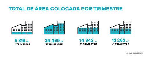 Comparativamente ao período homólogo (2021), houve um ligeiro crescimento na área colocada, que se traduziu num aumento de 3% (mais 1.908 m²), sustentado pelo número de transacções que passou de 63 para 76 (crescimento de 21%). Em termos de área média de superfície contratada por operação, verificou-se um decréscimo de 14% (de 898 m² em 2021, para 770 m² em 2022).
