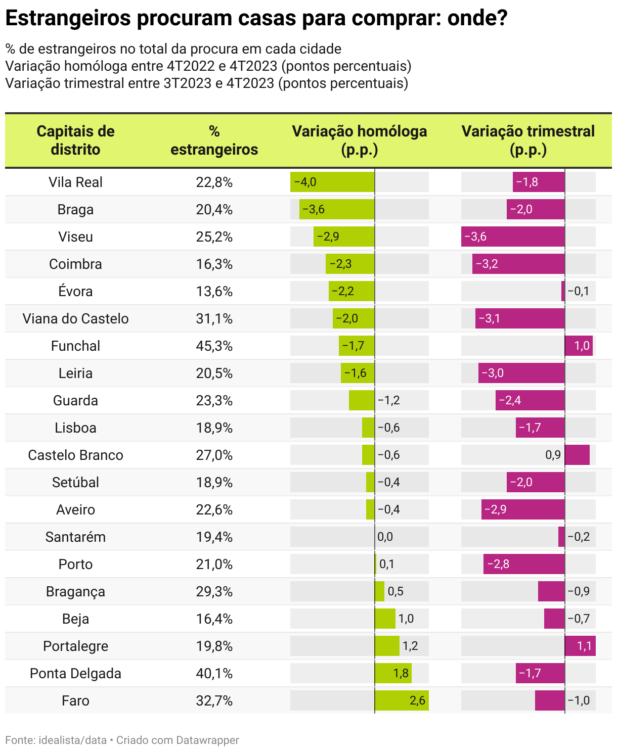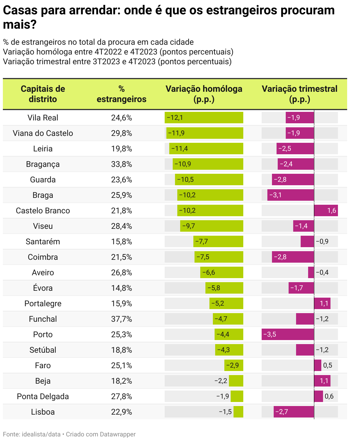 Esta queda da procura internacional no mercado de arrendamento português foi sentida em todas as capitais de distrito no final de 2023 face ao mesmo período do ano passado, com a maior queda a ser registada em Vila Real (-12,1 pontos percentuais) e a menor em Lisboa (-1,5 pontos percentuais), revelam ainda os mesmos dados do idealista/data. A nível trimestral observou-se um arrefecimento do interesse em 14 grandes cidades, Porto e Lisboa incluídos.