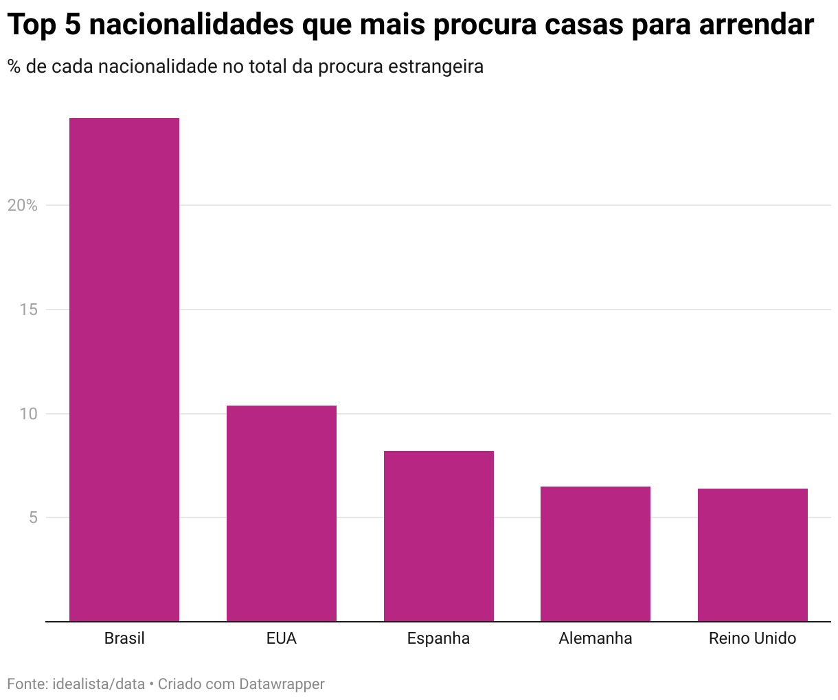 É dos EUA que se regista a segunda maior procura de casas no mercado de arrendamento português por parte de estrangeiros (10,4% do total), seguida de Espanha (8,2%), Alemanha (6,5%) e Reino Unido (6,4%), indicam ainda os mesmos dados. Muitos destes estrangeiros que resolvem arrendar casa no país são nómadas digitais e reformados que procuram clima ameno, conjugado com um bom custo de vida.