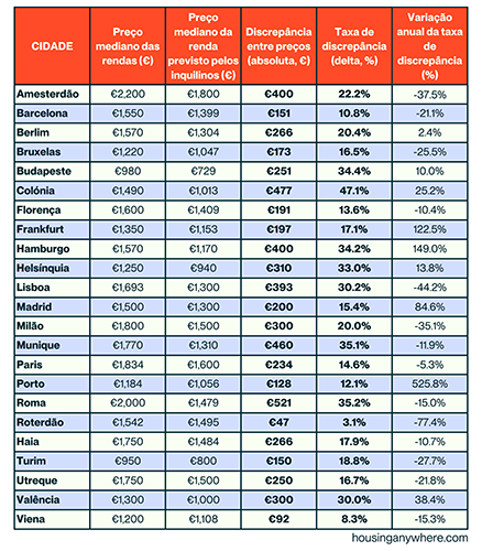De um modo geral, a taxa de discrepância na Europa diminuiu em relação ao ano passado, com reduções em 14 das 23 cidades, reflectindo o abrandamento europeu do aumento das rendas.
