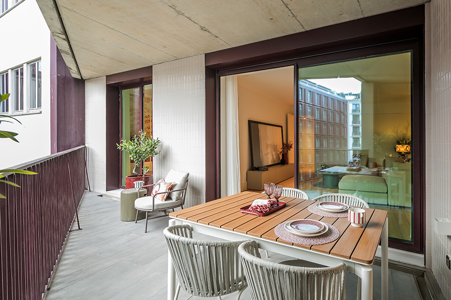 A ampla zona social prolonga-se para o exterior através da varanda, sendo um convite à partilha de bons momentos entre família e amigos.