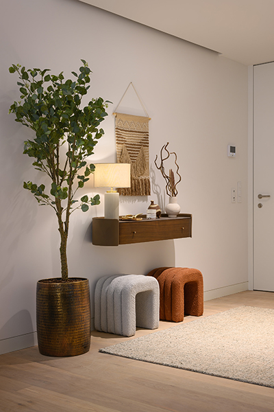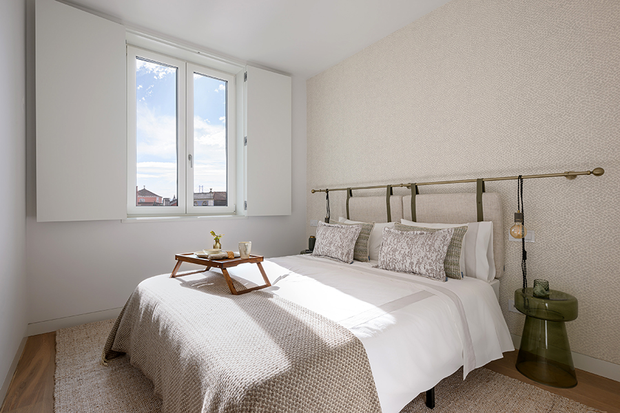 No condomínio privado Villa Infante, situado no bairro da Estrela e em fase final de construção, Filipa Fleming transformou um apartamento-modelo de tipologia T2 numa expressão de elegância simples e sofisticação. Os tons neutros de bege, com detalhes acobreados, dourado envelhecido, verde seco e cores terra, criam um ambiente familiar, assente em linhas modernas.