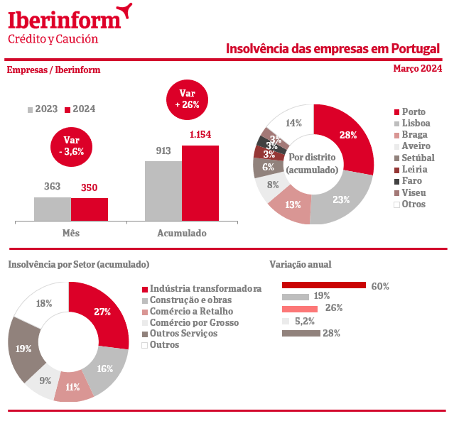 No período em análise, verificou-se um total de 1.154 acções de insolvência contra 913 registadas há um ano. O mês de Março teve um ligeiro decréscimo face ao mesmo período de 2023, com 350 ações de insolvência, menos treze que no ano passado (-3,6%).
