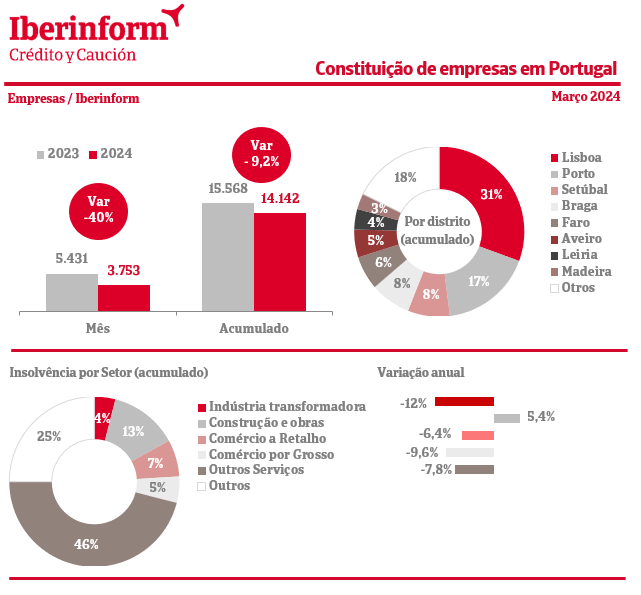Em Março de 2024, face ao mesmo período do ano passado, a criação de novas empresas decresceu 31%, passando de 5.431 em 2023 para um total de 3.753 em 2024, menos 1.678 constituições no comparativo. Contudo, no total do primeiro trimestre, o decréscimo é menos significativo, com uma descida de 9,2% de 15.568 novas empresas constituídas em 2023 para 14.142 constituídas em 2024.