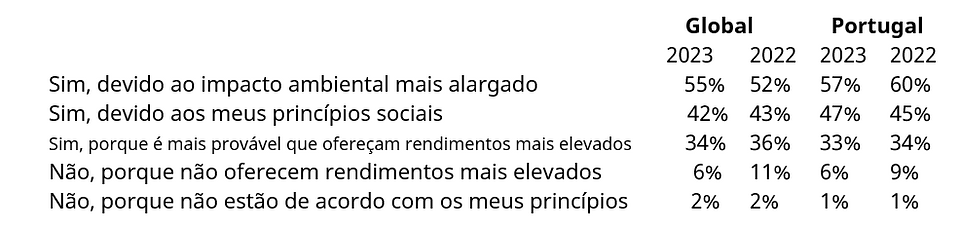Os investidores são atraídos para investir de forma sustentável devido ao potencial de gerar um impacto ambiental positivo e alinhar os investimentos com os seus princípios sociais. Estas foram as duas principais razões apontadas pelos investidores a nível global e em Portugal. O impacto ambiental é o principal foco para os investidores globais (55%) e para os portugueses (57%).
