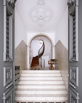 No interior, o hall de entrada (com pé-direito de 4,40 metros) é também recuperado e irá exibir uma antiga cadeira Olaio restaurada e que foi encontrada no próprio edifício. Será igualmente reabilitada a escadaria original, mantendo, assim, uma peça fundamental na preservação da estética da época. As portas dos apartamentos - novas e duplas – têm o desenho das originais.