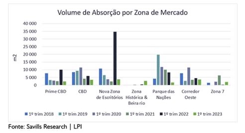 As zonas 3 (Nova Zona de Escritórios) e 6 (Corredor Oeste) com 3.794 m2 e 3.729 m2 respetivamente, verificaram os volumes de absorção mais altos dos primeiros três meses do trimestre. Ainda assim, os valores alcançados não foram suficientes para evitar decréscimos homólogos na ordem dos 89% e dos 19%.