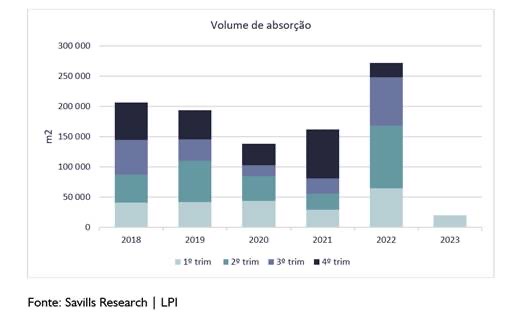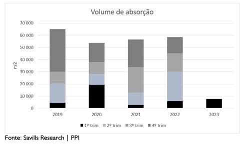 No final do 1º trimestre de 2023, o mercado de escritórios do Porto somou um volume de absorção total de 7.689 m2, um resultado que ficou acima 32% comparativamente ao mesmo período do ano 2022 e apenas 5% abaixo da média dos primeiros trimestres dos últimos quatro anos.