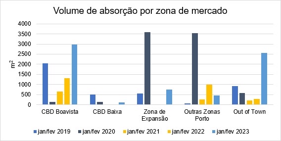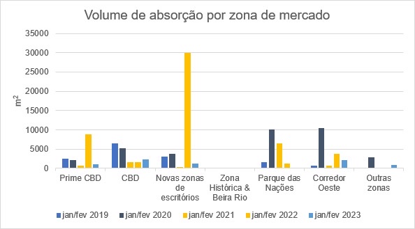 No mercado de escritórios do Porto, o volume de absorção total relativo aos primeiros dois meses do 2023 situou-se nos 6.881 m2, um aumento muito expressivo de 166% comparativamente ao período homologo de 2022. O resultado alcançado encontra-se 50% da média dos últimos 5 anos para o mesmo período.