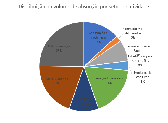 No que concerne ao volume de absorção por setor de atividade, destaca-se o setor de Outros Serviços, TMT´s & Utilities e Serviços Financeiros, com um peso de 63% no volume de absorção total.
