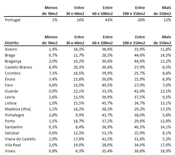 Analisando por distritos, apenas a Guarda não teve nenhum apartamento com áreas inferiores a 30m2 nos três meses analisados. Com uma incidência inferior a 1% de casas com menos de 30m2, encontram-se Santarém (0,3%), Setúbal (0,6%), Faro (0,6%), Braga (0,7%) e Viseu (0,8%). Em seguida, temos Lisboa (1%), a ilha da Madeira (1,1%), Aveiro (1,4%), Porto (1,5%), Vila Real (2%), Bragança (2%), Leiria (2,6%) e Portalegre (2,8%).