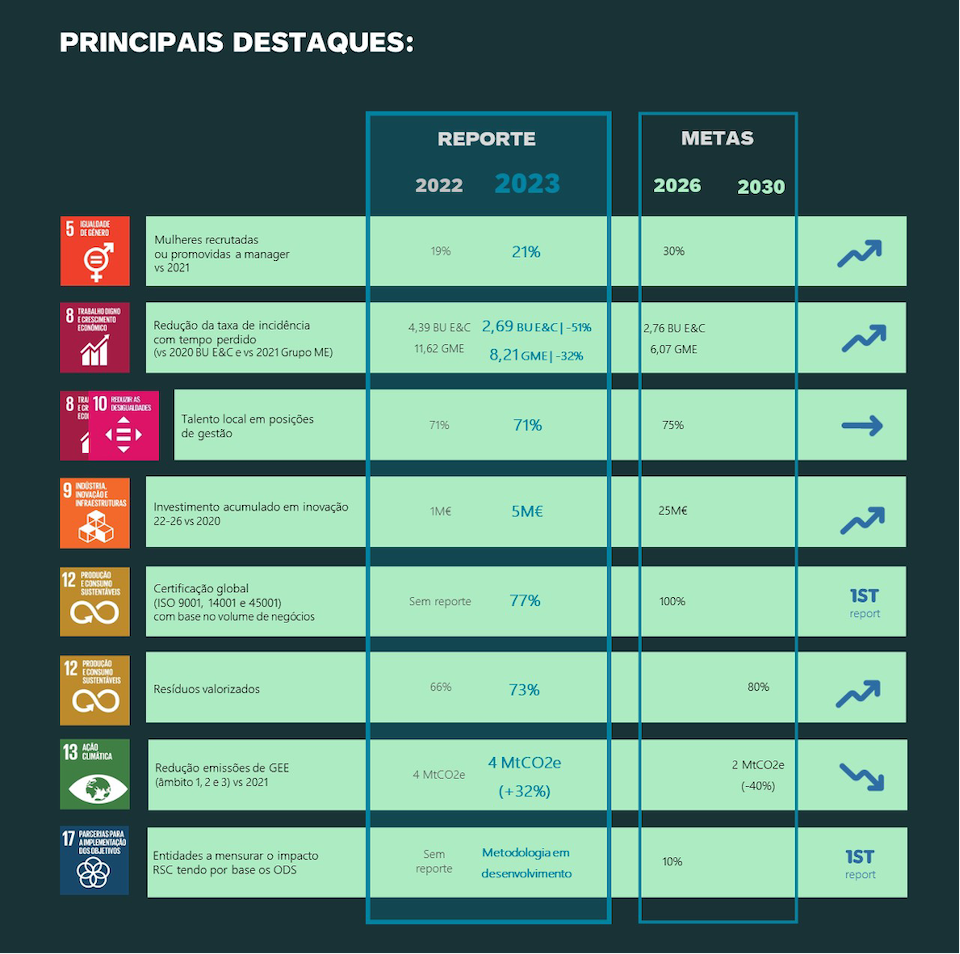 Em 2023, apresentou a performance desses objectivos destacando a evolução positiva nomeadamente na redução de acidentes com baixa, sendo a segurança dos nossos trabalhadores uma prioridade; e da percentagem de mulheres em posição de gestão, reforçando a ambição em ser um Grupo inclusivo e atractivo ao novo talento.