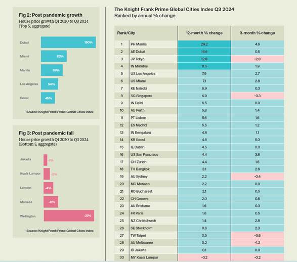 Manila continuou a registar um notável aumento – ocupa o primeiro lugar – com um crescimento de 4,6% nos últimos três meses e um aumento anual de 29,2% impulsionado pelo forte crescimento económico e pelo aumento da confiança dos consumidores.